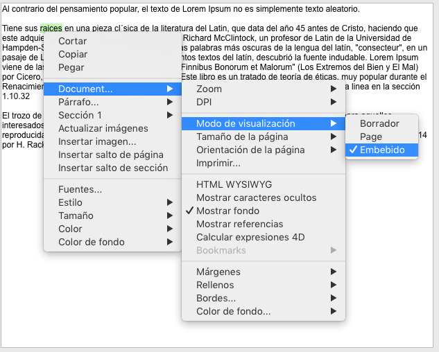 Embebido: modo de vista conveniente para áreas anidadas; no muestra márgenes, pies de página, encabezados, columnas, marcos de página, etc. Este modo también se puede utilizar para producir una salida de vista como Web (si selecciona también la resolución 96 dpi y la opción HTML WYSIWYG).