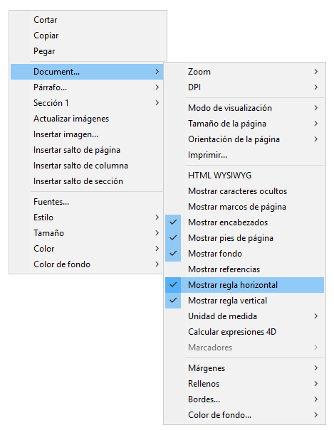 Puede cambiar el estado de visualización de las reglas por medio de acciones estándar (ver Utilizar las acciones estándar 4D Write Pro) o marcando o desmarcando la opción Mostrar regla horizontal o Mostrar regla vertical en el menú contextual del área 4D Write Pro: