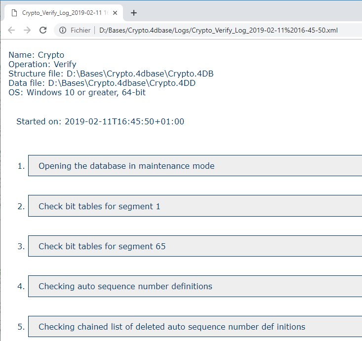 Sem importar a verificação solicitada, 4D gera um arquivo de histórico na pasta do banco. Este arquivo lista todas as verificações efetuadas e indica os erros encontrados, quando aplica ([OK] se mostra quando a verificação é correta). Se cria em formato XML e HTML e se chama “NomeBanco_Verify_log<yyyy-mm-dd hh-mm-ss>.xml"”.