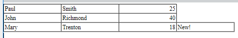 $wpRow3:=WP Table append row($wpTable;"Mary";"Trenton";18;"New!")