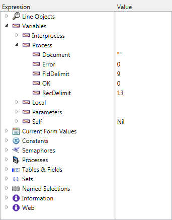 カレント(現在トレースの対象となっている)プロセスで定義されているセットを一覧表示します。インタープロセスセットも一覧表示 します。各セットでは、値欄にレコードの数とテーブル名が表示されます。セットを使用していない場合には、このリストは空白の場合があります。このテーマ からの表現式を修正することはできません。