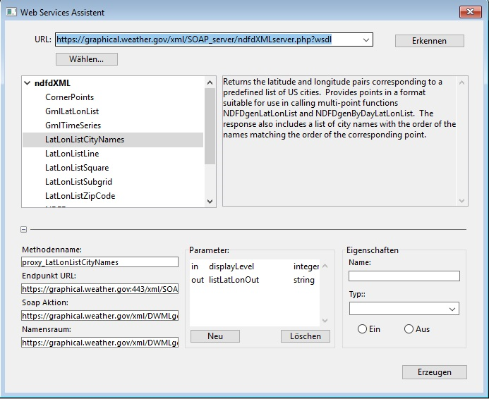 Die Schaltfläche Erkennen durchsucht die angegebene WSDL Datei und setzt die Informationen in den darunterliegenden Bereich ein.