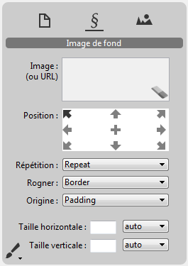 Ce panneau gère les images d'arrière-plan de la zone 4D Write Pro. Vous pouvez glisser-déposer des images ou des URLs directement dans la zone Image. Vous pouvez également cliquer avec le bouton droit dans la zone Image afin d'afficher une liste de motifs d'arrière-plan disponibles par défaut. Vous pouvez définir la position et la taille de chaque image ou motif ainsi que des paramètres personnalisés. Vous pouvez utiliser l'icône pour supprimer une image ou un motif existant(e).