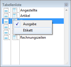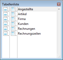 Vor jedem Tabellennamen im Fenster gibt es zwei Icons für Eingabe- und Ausgabeformulare. Das erste Icon zeigt die Eingabeformulare, das zweite Icon die Ausgabeformulare.