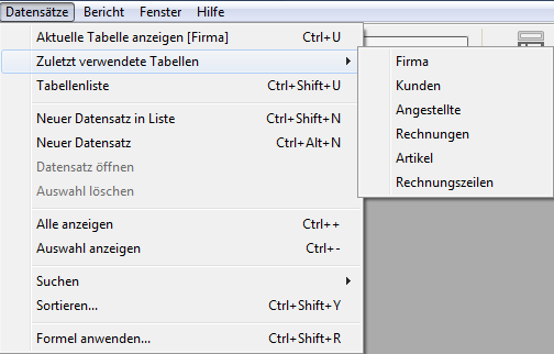 Wählen Sie im Menü Datensätze>Zuletzt verwendete Tabellen eine Tabelle aus.