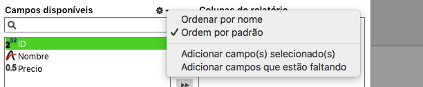 Pode usar o menu de ação Para ordenar a lista Campos disponíveis, ou simplesmente adicione campos mútiplos desta lista para a lista Colunas de relatório