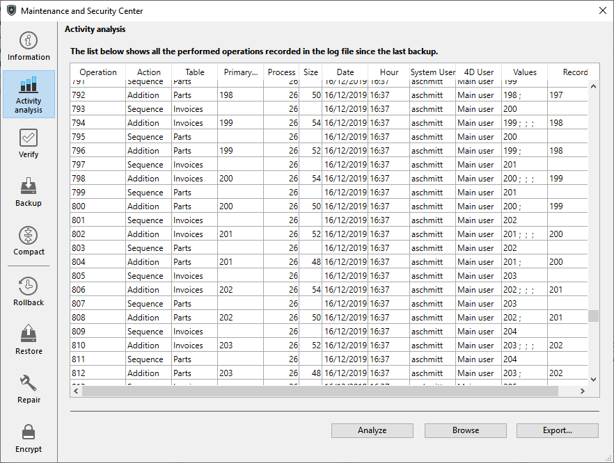 - Usuário: nome do usuário que efetuou a operação. No modo cliente-servidor, aparece o nome da máquina do cliente; no modo monousuário, aparece a identificação do usuário. Se as senhas de 4D não estão ativas, esta coluna fica vazia.