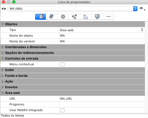 Duas variáveis específicas estão automaticamente associadas a cada área de web: “URL” e “Progressão.” Estas variáveis permitem controlar respectivamente o URL mostrado pela área de web e a porcentagem de carregamento da página mostrada na área de web. Por padrão, estas variáveis chamam-se, respectivamente, nomeArea_url e nomeArea_progress. É possível alterar estes nomes se preferir.