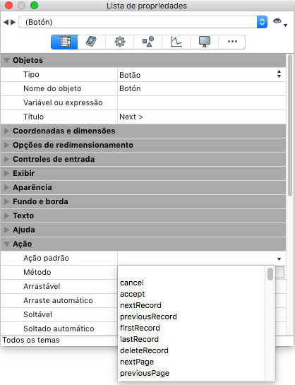 Se quiser que o botão realize uma ação não disponível como ação padrão, deixe o campo Ação Padrão vazio e escreva um método objeto que especifique a ação do botão (ver Editar Métodos).