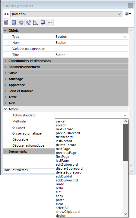 Généralement, les boutons sont placés dans les formulaires au moment de la création du formulaire dans l’assistant de création de formulaires. Vous pouvez modifier les actions de ces boutons dans la Liste des propriétés. Par exemple, vous pouvez supprimer l’action automatique d’un bouton et écrire une méthode qui lui affecte un autre rôle.
