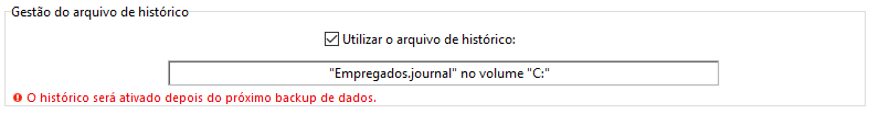 A opção Utilizar o arquivo de histórico, quando está selecionada, indica que o banco utiliza um arquivo de histórico. Sua rota de acesso se encontra abaixo dessa opção. Quando esta opção está selecionada, não é possível abrir o banco de dados sem o arquivo de histórico.