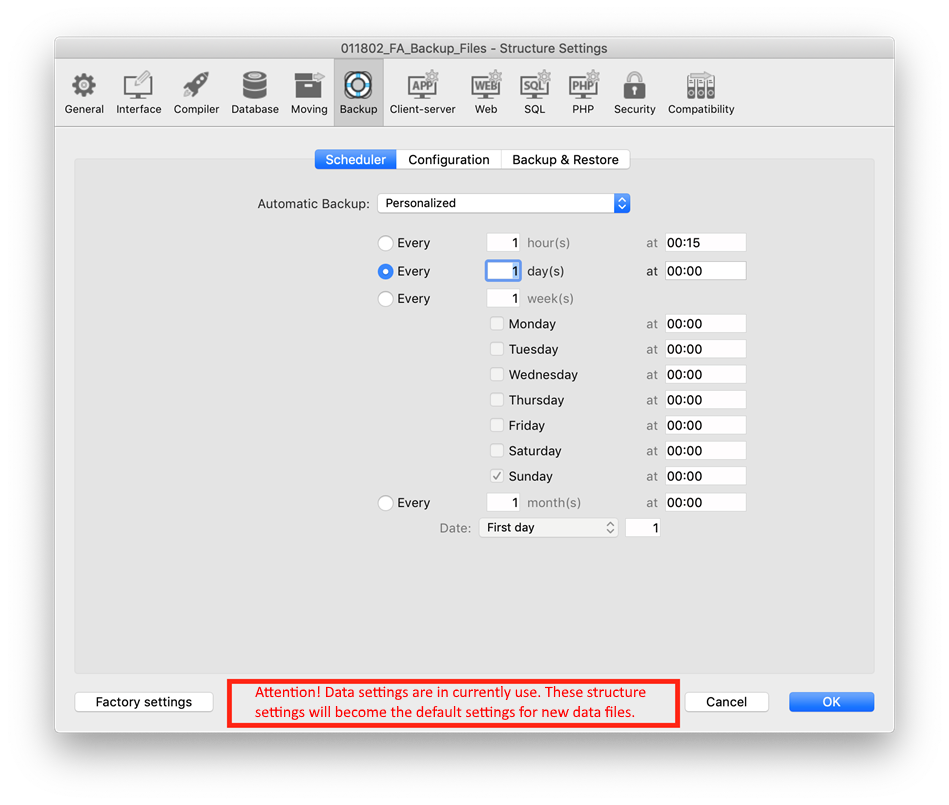 Pode acontecer que precise editar o arquivo de configuração de backup pré-determinado (configuração da estrutura), enquanto usar um arquivo de configuração de backup para os dados usuário. Neste caso se usará para o arquivo de dados atual, mas se salvará no arquivo "backup.4DSettings" do banco de dados e se utilizará normalmente para todo novo arquivo de dados. Se mostra uma mensagem de advertência no quadro de diálogo Propriedades: