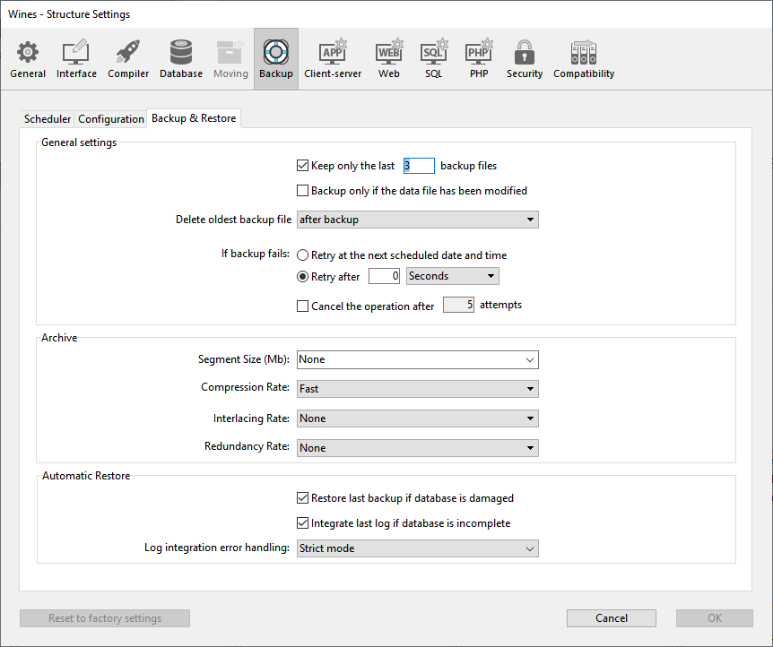 • Restaurar el último backup si la base de datos está dañada: cuando esta opción está marcada, el programa inicia automáticamente la restauración del archivo de datos del último backup válido de la base, si detecta alguna anomalía (por ejemplo un archivo corrupto) durante el lanzamiento de la base. No es necesaria ninguna intervención por parte del usuario; sin embargo, a operación se registra en el diario del backup.