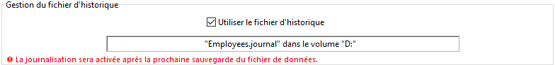 L’option Utiliser le fichier d’historique indique, lorsqu’elle est cochée, que la base exploite un fichier d’historique. Son chemin d’accès est précisé au-dessous de l’option. Lorsque cette option est cochée, il n’est pas possible d’ouvrir la base sans fichier d’historique.