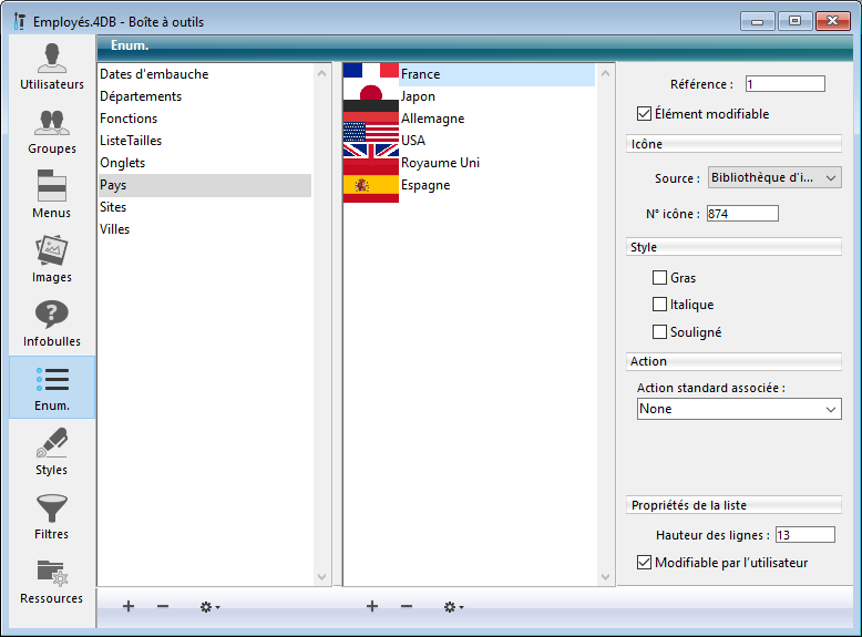 4D vous permet de spécifier si une énumération peut être modifiée par l’utilisateur. Par défaut, les énumérations que vous créez ne sont pas modifiables.