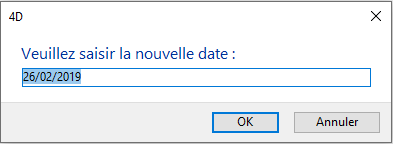 $vdPrompt:=Date(Demander("Veuillez saisir la nouvelle date :";Chaine(Date du jour)))