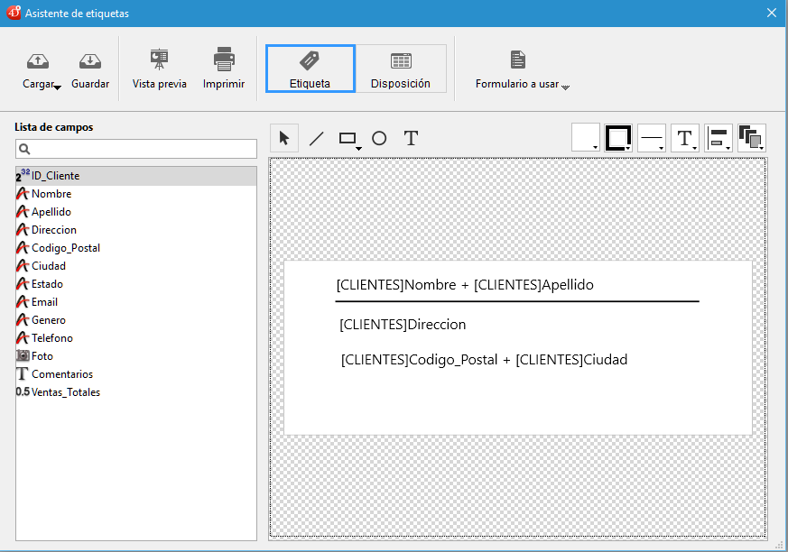 Para utilizar un campo de esta lista en su plantilla de etiqueta, arrástrelo al área de previsualización de la etiqueta a la derecha de la lista.