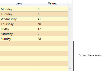 Zusätzliche Leerzeilen ausblenden: Steuert die Anzeige der am Ende der Listbox hinzugefügten Leerzeilen. Standardmäßig fügt 4D solche Extrazeilen am Ende eines Objekts Listbox hinzu, um den leeren Bereich zu füllen: Markieren Sie diese Option, erscheint das Objekt Listbox ohne Leerzeilen am Ende:
