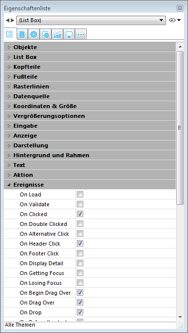 Das Programm kann diese Ereignisse nur ausführen, wenn sie in der Eigenschaftenliste für das jeweilige Quell- und Zielobjekt entsprechend aktiviert wurden:
