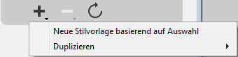 Dann wählen Sie den Textausschnitt aus, für den sie gelten soll und klicken am unteren Rand des Steuer-Panels auf die Schaltfläche . Sie können eine neue Stilvorlage erstellen oder eine vorhandene duplizieren: