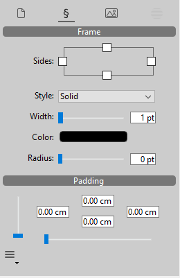 Frames can be set for the document as a whole and/or for individual paragraphs, or for pictures found in the text. You use the icons at the top of the panel to configure these settings separately for the desired area: i.e., for the document,