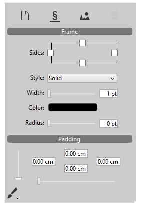 枠線はドキュメント全体に対して、あるいは個別の段落に対して、またはテキスト内のピクチャーに対して設定することができます。パネル上部のアイコンに対して、指定したいエリアでのこれらの対象を設定します。つまり、ドキュメントに対してはボタンを、個別の段落に対しては