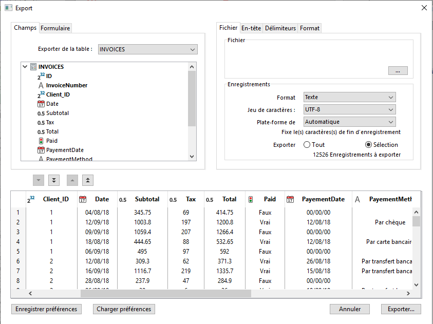 6. Dans la zone “Enregistrements”, indiquez si vous souhaitez exporter la totalité des enregistrements de la table sélectionnée (option Exporter tout) ou uniquement la sélection courante (option Exporter sélection).