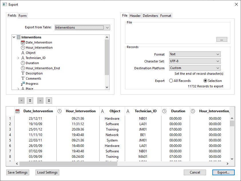 データを書き出す際に、4D、XML、SYLK、DIFF、DBF、テキスト、または固定長テキストフォーマットのファイルを作成することができます。これらのファイルは、別のアプリケーションからオープンしたり、読み込むことが可能です。他のアプリケーションで使用するためにデータを書き出す場合は、そのアプリケーションのドキュメントを参照し、データ読み込みに関する情報を調べて、そのアプリケーションと互換性があるファイルフォーマットと区切り文字を選択してください。