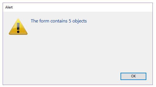 ALERT("The form contains "+String(size of array(objectsArray))+" objects") //devuelve el conteo de objetos
