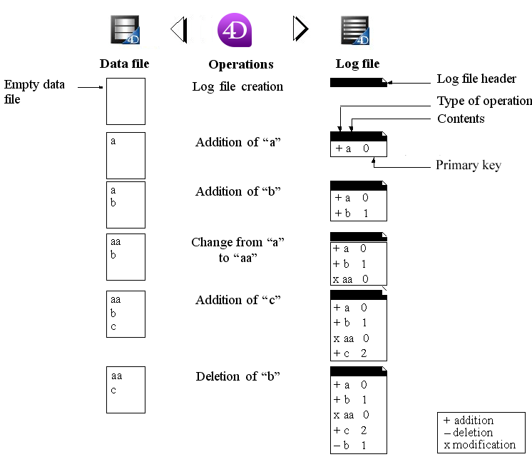 O arquivo de histórico é administrado por 4D, levando em conta igualmente todas as operações que afetam o arquivo de dados, sem importar as manipulações efetuadas por um usuário, os sistemas 4D, o motor SQL, os plug-ins 4D (4D Write, 4D View, etc.), um navegador de Web.