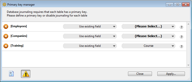 ![]() | Sin llave primaria, sin campo(s) elegible(s) | La tabla no tiene una llave primaria, pero contiene al menos un campo que podría convertirse en llave primaria (será necesario crear un campo llave primaria). |