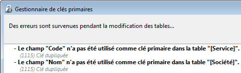 Si vous avez désigné des champs existants en tant que clés primaires, 4D vérifie dans chaque table que les données existantes respectent les règles d’unicité et de non-nullité de ce type de champ. Si par exemple un champ comporte des valeurs dupliquées (doublons) ou des valeurs nulles, une erreur est générée :