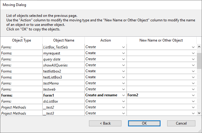 The “New Name or Other Object” column displays the name that will be attributed to the object once it is copied into the destination database. You can change this name (be careful not to use a name that already exists in the destination database since this would create a new name conflict). In the case of dependent objects, this column also lets you designate another object in the destination database (when the Use another object action is selected). For example, when moving a table form, you can designate a table in the destination database as the table it will belong to instead of creating the table.