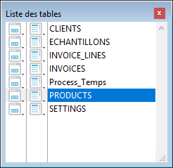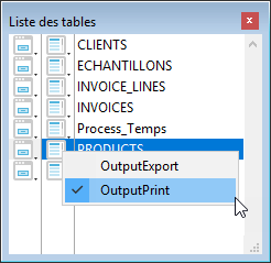 Chaque nom de table dans la fenêtre est précédé de deux icônes symbolisant les formulaires entrée et sortie. L’icône de gauche liste les formulaires Entrée. L’icône de droite liste les formulaires Sortie.