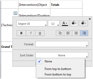 Para ordenar as categorias em um relatório em tabela cruzada, abra a janela contextual relacionada com a categoría e seleciona um valor no menu Sentido de ordem da janela pop up: