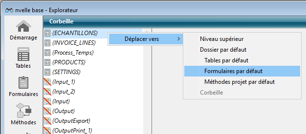 La page Corbeille de l’Explorateur rassemble tous les objets de type Dossier, Table, Formulaire ou Méthode projet ayant été supprimés dans la base.