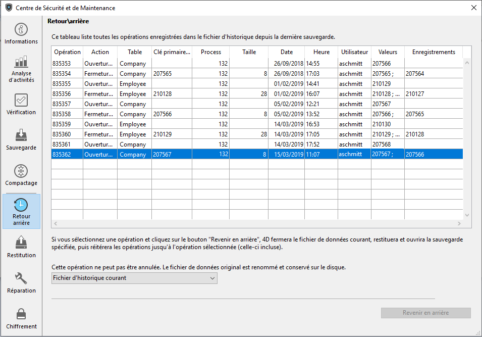 Cliquez ensuite sur le bouton Revenir en arrière. 4D vous demande de confirmer l’opération.