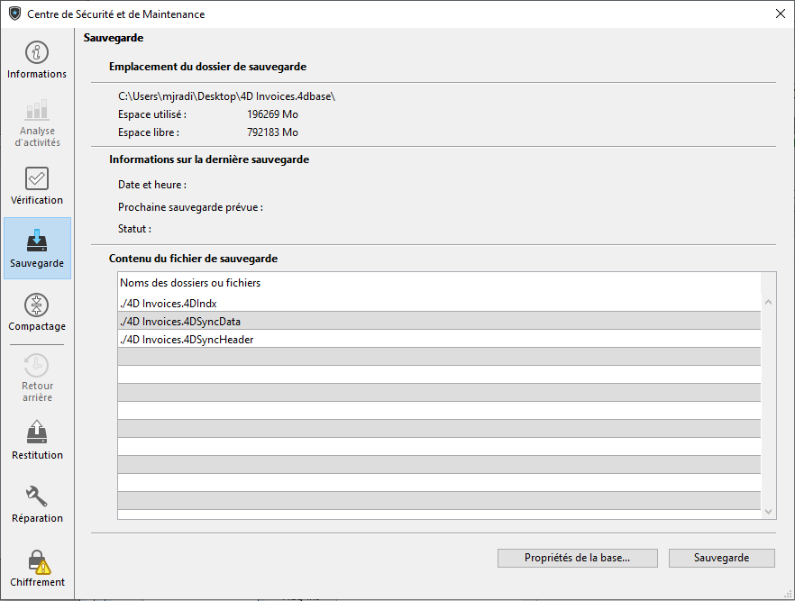 • Informations sur la dernière sauvegarde : fournit la date et l’heure de la dernière sauvegarde (automatique ou manuelle) réalisée sur la base.
