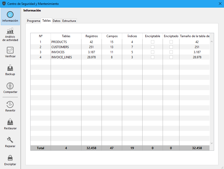 • Registros: número total de registros de la tabla. Si un registro está dañado o no se puede leer, aparece Error en lugar del número. En este caso, puede considerar el uso de las herramientas de verificación y reparación.