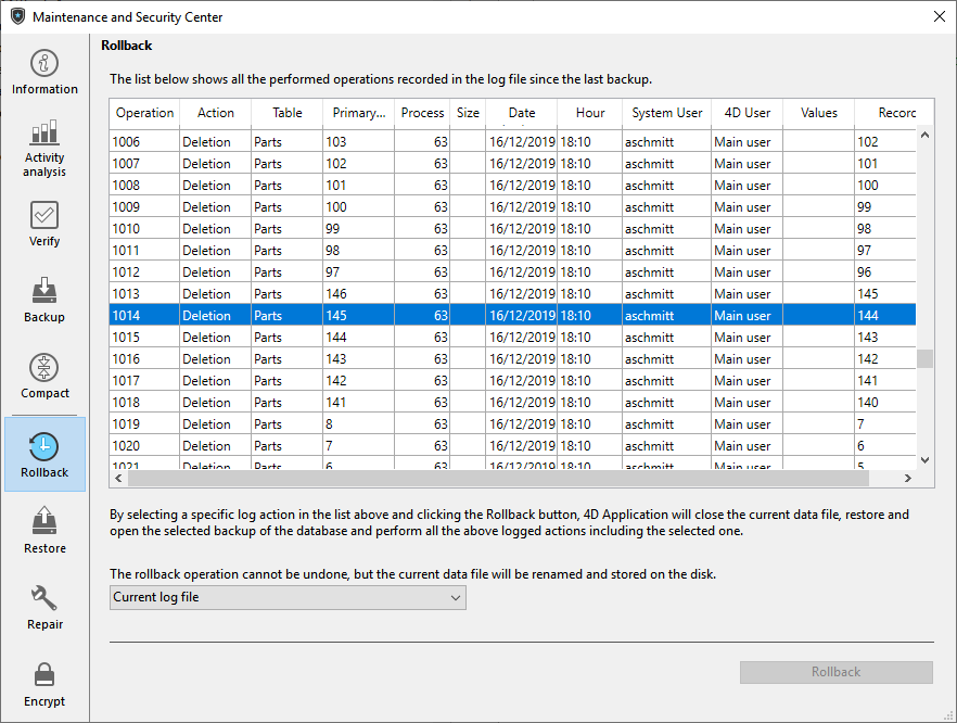 Así es cómo funciona la función retroceder: cuando el usuario hace clic en el botón Restaurar, 4D cierra la base actual y restaura el último backup de datos de la base. La base restaurada se abre y 4D integra las operaciones del historial hasta la operación seleccionada. Si la base no se ha guardado, 4D parte de un archivo de datos vacío.