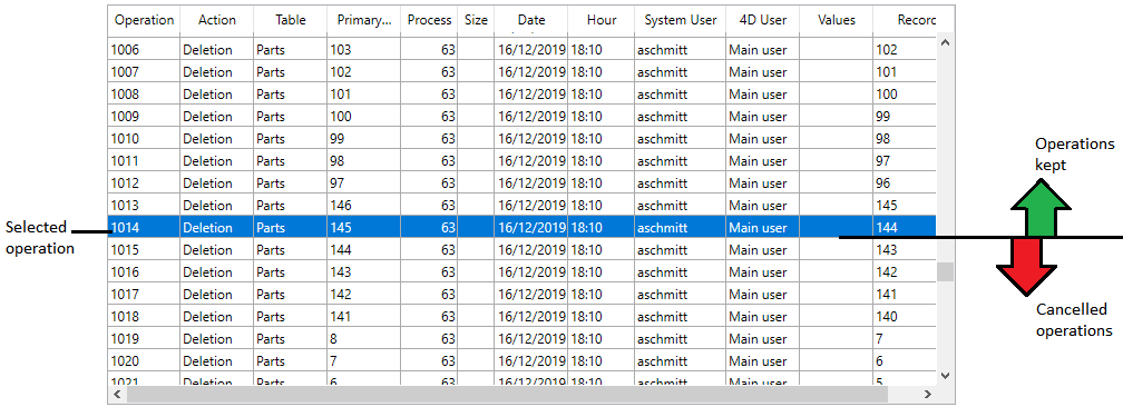 Para realizar una restauración entre las operaciones, seleccione la línea después de la cual se deben cancelar todas las operaciones. La operación de la línea seleccionada será la última que se conservará. Si por ejemplo, quiere cancelar una eliminación, seleccione la operación ubicada justo antes de la eliminación. Se cancelará la operación de eliminación así como todas las operaciones siguientes.