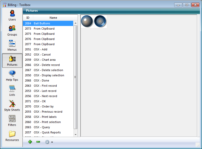 La ventana de la librería de imágenes muestra la lista de imágenes almacenadas en la base. Incluyendo los comandos de gestión de imágenes como también un área de visualización: