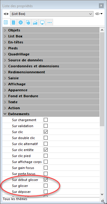 • List box : Propriété "Glissable" et événement "Sur début glisser" cochés
