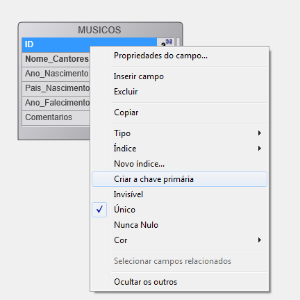 Dê um clique direito e escolha Create primary key no menu contextual (este comando só é exibido para campos cujo tipo é adequado para chaves primárias) [#picture id="106919" language="en" ] Não é possível ter mais que uma chave primária por tabela. Se uma chave primária já tiver sido especificada, um caixa de diálogo de alerta aparece indicando que a chave pimária existente será primeiro desativada.