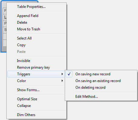 É possível acessar diretamente ao trigger de uma tabela através da janela de estrutura clicando no botão Editar... do Inspetor ou selecionando Editar método... no sub-menu contextual. Para maiores informações sobre triggers, consulte a seção ..
