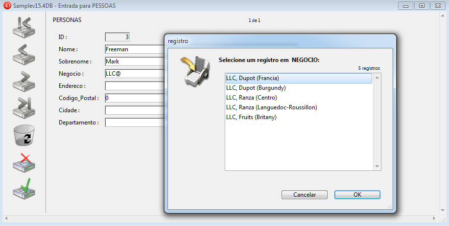 Seria possível encontrar mais de um registro se campoN termina com o caractere arroba (@). Se só houver uma coincidência, não aparece a lista. Especificar um campo em discriminante é o mesmo que definir um campo discriminante na caixa de diálogo de definição das propriedades de uma relação no ambiente Desenho. Para maior informação sobre a definição de um campo discriminante, consulte o Manual de Desenho de 4D.