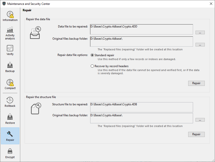 数が多くないレコードやインデックスが損傷を受けているケースでは、標準の修復を選択します。データは圧縮および修復されます。このタイプの修復を行うためにはデータファイルとストラクチャーファイルが対応していなければなりません。