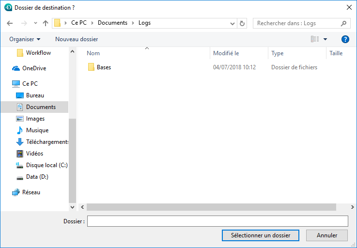 La commande Selectionner dossier affiche une boîte de dialogue standard de navigation à travers les volumes et les dossiers du poste.