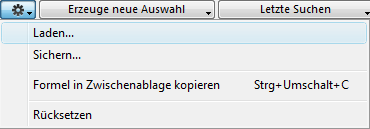 Wird im Ordner Resources->Queries mindestens eine .4df Suchdatei zur aktuellen Tabelle gefunden, wird im Sucheditor am Ende des Menüs ein neuer Eintrag Laden > angefügt. Das DropDown-Menü zeigt die Einträge der vordefinierten Suchen:
