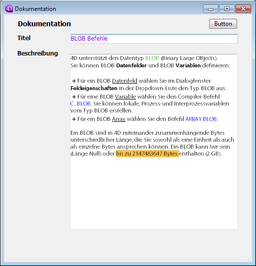 Die Beschreibung der Befehle zum Verwalten von Rich Text Bereichen und die unterstützten <span> Tags finden Sie im Kapitel Mehrfachstil Text des Handbuchs 4D Programmiersprache.